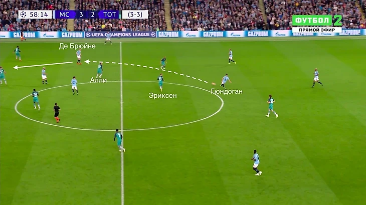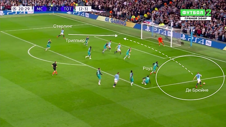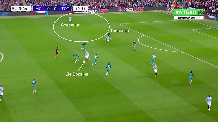 Де Брюйне в центре с мячом, Рахим Стерлинг свободен на фланге. Игроки «Тоттенхэма» втроем позволят сделать пас на Стерлинга и англичанин на скорости войдет в штрафную и неотразимо пробьет