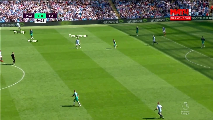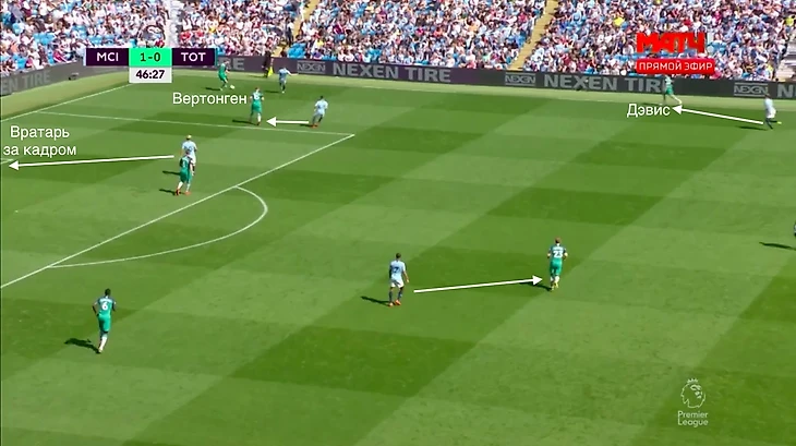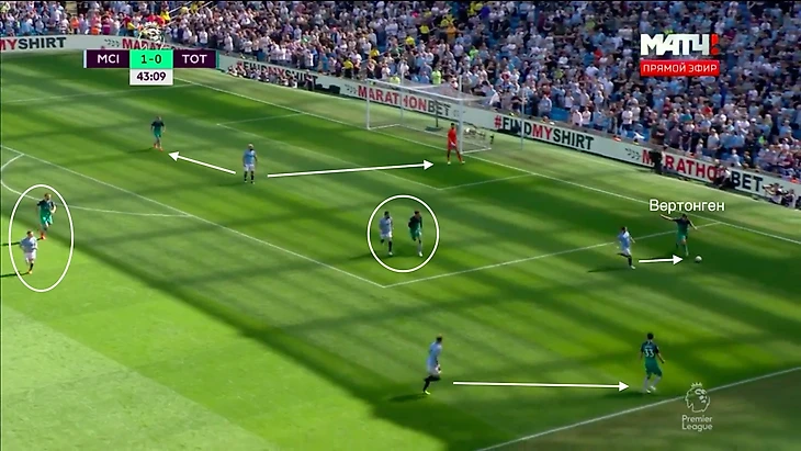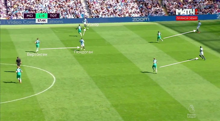 Ян Вертонген поднимается в полузащиту и играет против Гюндогана. Уокер под давлением и два других защитника – тоже. «Тоттенхэм» отберет мяч и проведет быструю атаку.