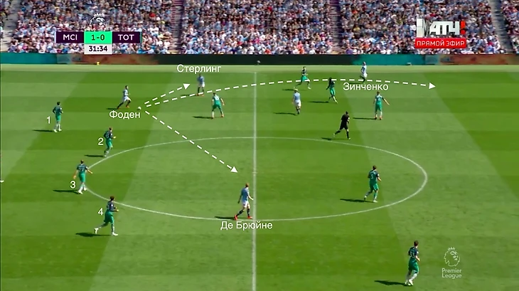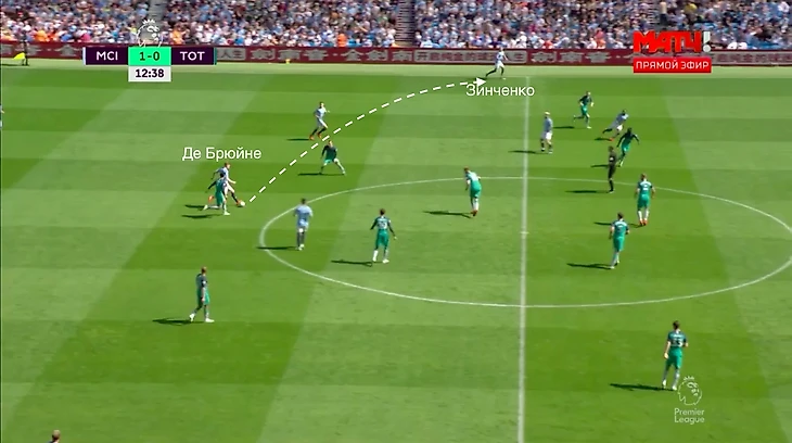 Бельгиец пробежал с мячом до середины поля и заставил стянутся на себя полузащитников. Когда их количество в центре увеличилось, Де Брюйне направил мяч на свободного Зинченко.