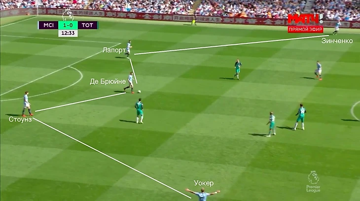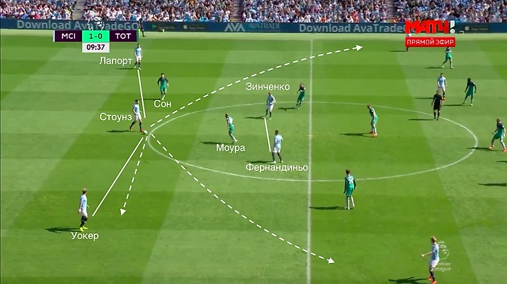 Проходит 11 секунд. Стоунз вновь с мячом, а Зинченко уже переместился в центр поля, утащив за собой еще одного игрока соперника. Для защитника открыты игроки на флангах и менее рискованный вариант с Кайлом Уокером.