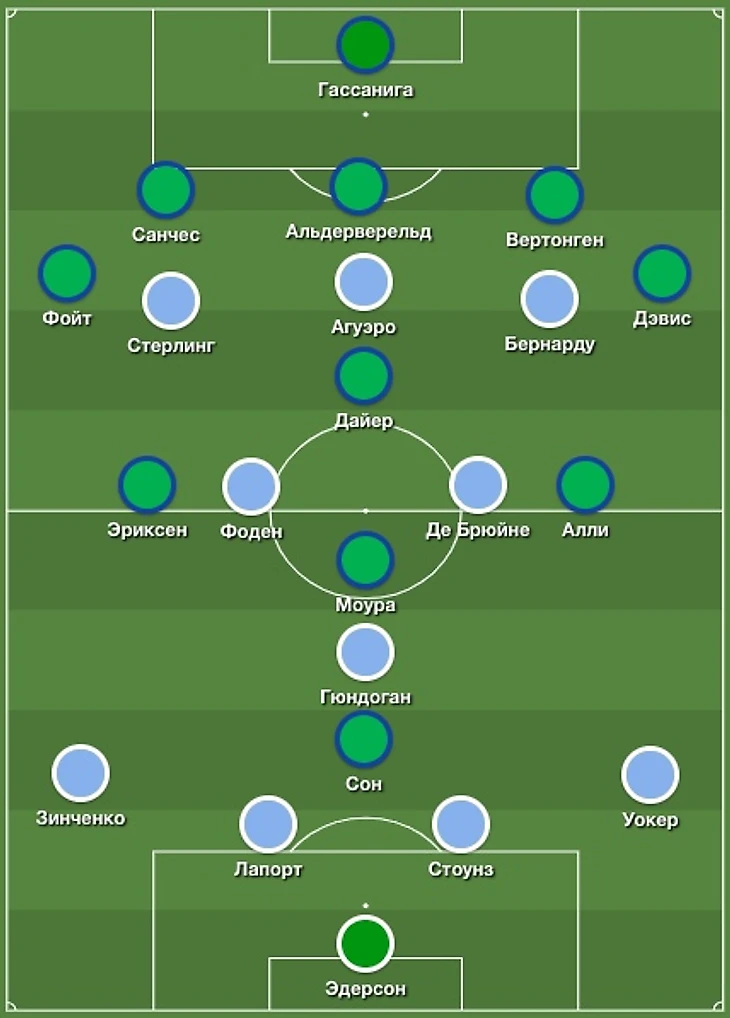 У Пепа Гвардиолы было два изменения в обороне: восстановился Александр Зинченко и сыграл слева, а в центр защиты вышел Джон Стоунз. В полузащите отсутствовал Давид Сильва, вместо испанца вышел Фил Фоден. Фернандиньо остался в запасе – в опорной зоне сыграл Илкай Гюндоган. Бразильца беспокоит травма и он еще полностью не восстановился.