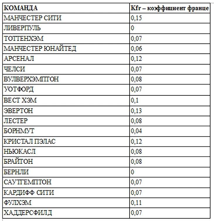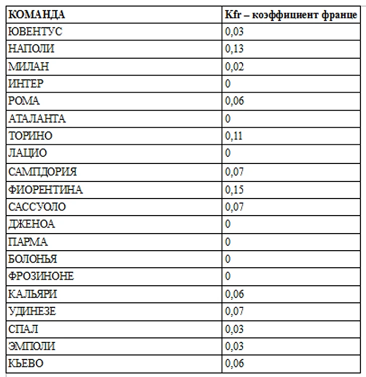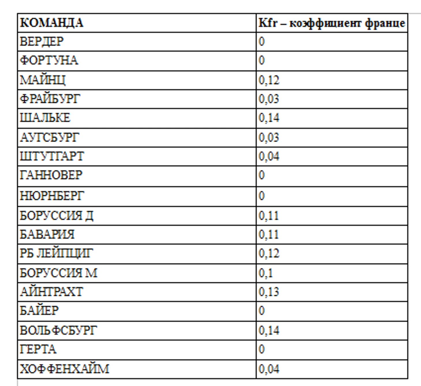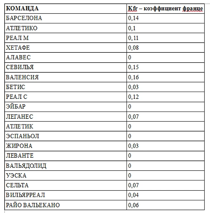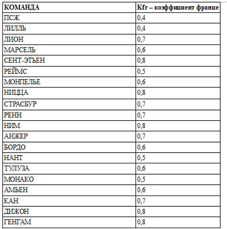 Я подумала, что вам будет интересно, как же обстоят дела в самой Франции. Что интересно, так это два лидера Лиги 1 - ПСЖ и Лилль, имеют худший показатель kFr=0.4. Сразу всё становится ясно и понятно. Затем идут Реймс, Нант и Монако с коэффициентом в 0.5. Остальные результаты вы можете увидеть сами.