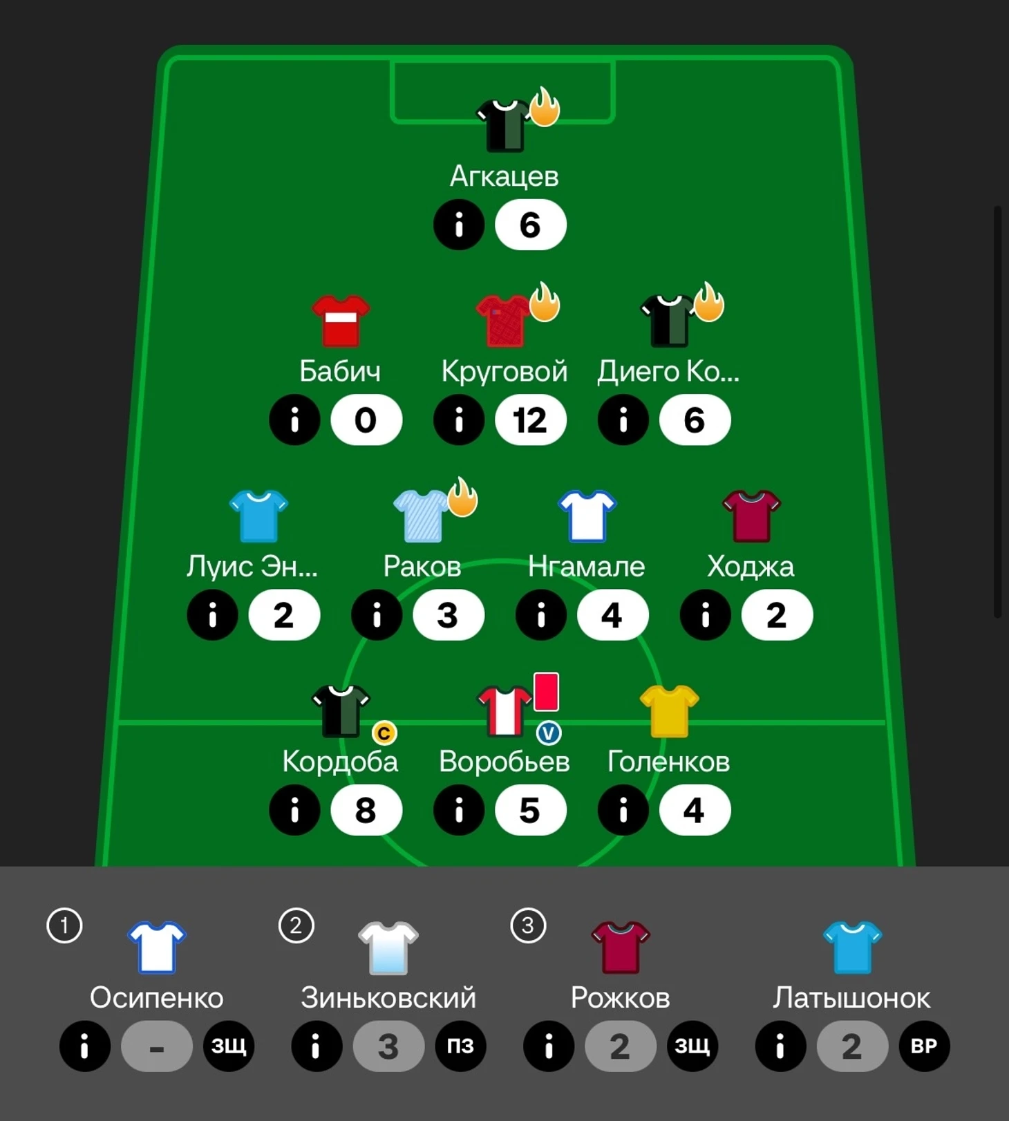 Практически полностью оправдала ставка на игроков «Краснодара» - жаль, что гол Кордобы отменили. Агкацев впервые вышел у меня в старте, а Кордобу я только взял в команду. Сухой матч для Агкацева и Косты, капитанство колубийца занесли мне 20 очков (почти половину об общего числа)