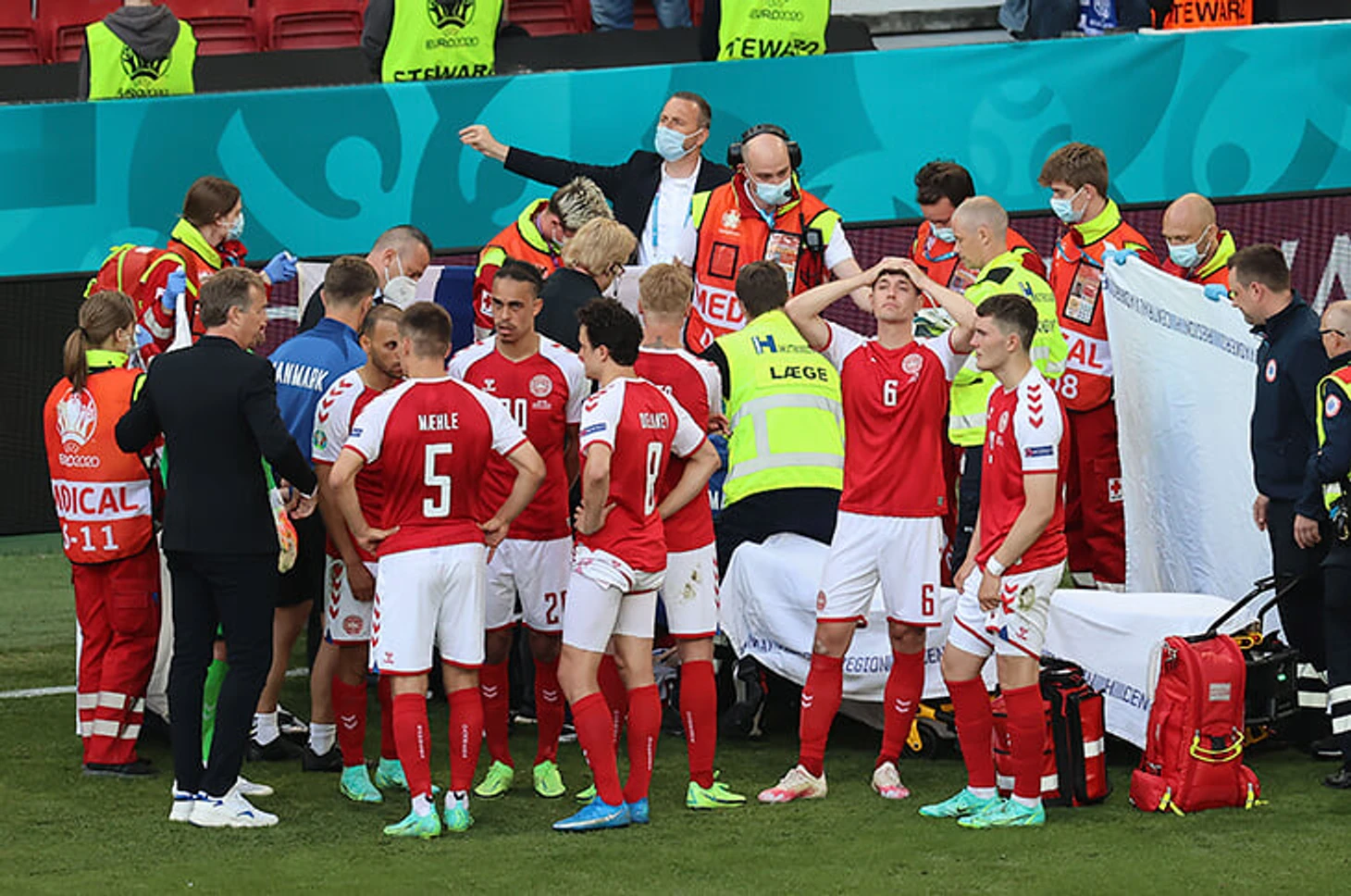 Страшный момент. Игроки сборной Дании закрывают собой Эриксена и не скрывают слез