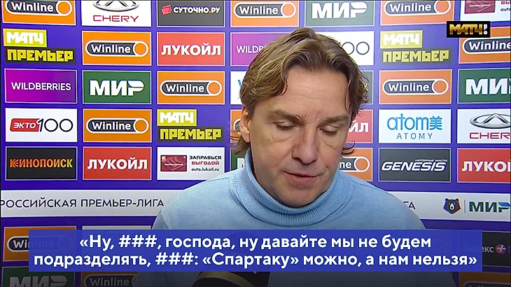 «Мне очень сложно понимать вот эти моменты, вот сейчас я посмотрел специально, мне видеооператор показал. Как такое не увидеть? Мозес, ###, бьет локтем, ну в лицо попадает. Стоит боковой судья, резервный, на ВАРе… Ну, ###, господа, ну давайте мы не будем подразделять, ###: если «Спартак» – им можно, если нам – нам нельзя. В результате чего получается вторая желтая Гоцука. Ну хватит этих уже моментов. Ну эти двойные стандарты – ну немножко уже достало.