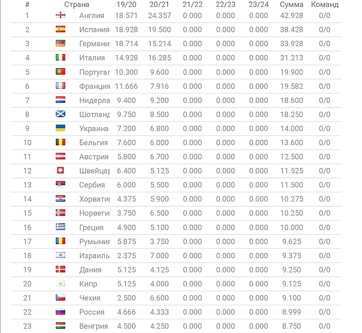 Как было сказано выше , постепенно уровень РПЛ катится ко дну . После сезона 2017-18 , где Россия набрала 12,600 баллов , ожидалось , что мы навяжем борьбу Франции за 5-ю позицию в таблице коэффициентов УЕФА. Сейчас становится ясно , что сохранение в топ 10 будет уже небольшой победой , ибо скоро мы рискуем оказаться на уровне таких "мощных" чемпионатов как Венгрия и Кипр.
