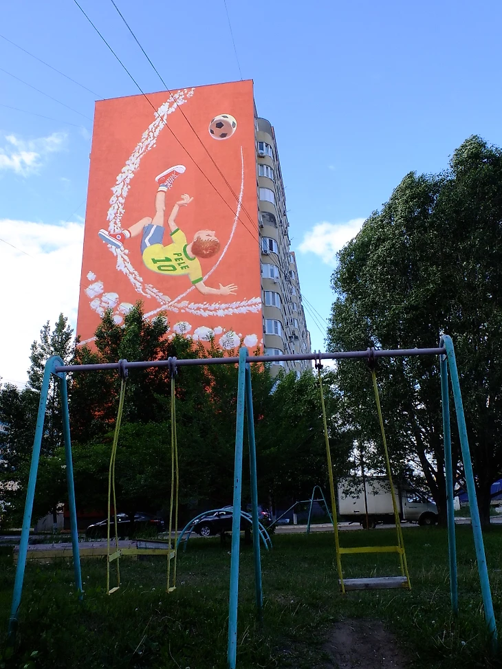Граффити посвящено Пеле, но на стене изображен не он. А мальчишка, который играет в футболке с десятым номером сборной Бразилии. Образ мальчик списан с сына художника Алексея Каллимы. Хотя сегодняшние пацаны гоняют мяч в футболках Неймара, а не Пеле. Но так видит художник.