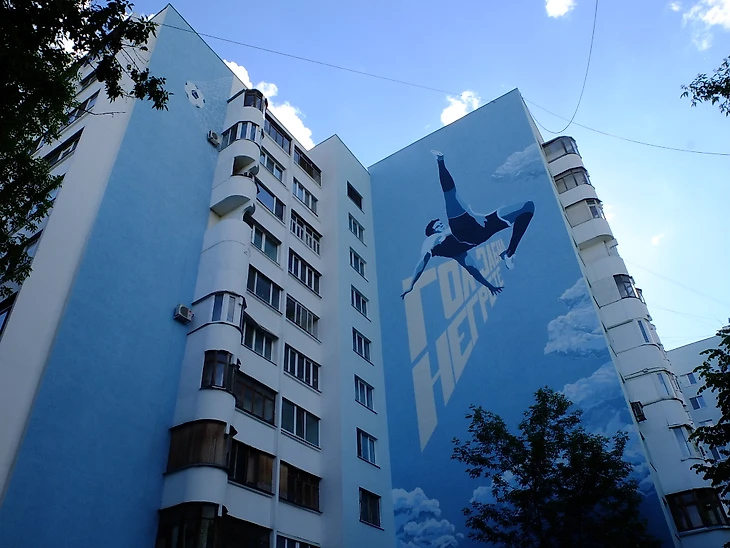 Мануэль Негрете из Мексики в 1986 году забил болгарам один из самых красивых голов чемпионатов мира. Именно этот удар нарисовал на стене художник Егор Федоричев. По стилю эта работа отсылка к советскому художнику Эрику Булатову, который рисовал в стиле монументализм.