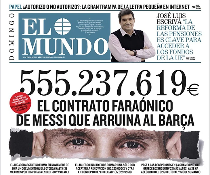 Испанское газетное издание El Mundo опубликовало в свежем номере статью о деталях контракта Лионеля Месси. Статья под названием «Контракт, разрушивший «Барселону», в которой утверждается, что за четыре года Месси должен получить около 555 237 619 евро, произвела общественный резонанс среди футбольного сообщества.