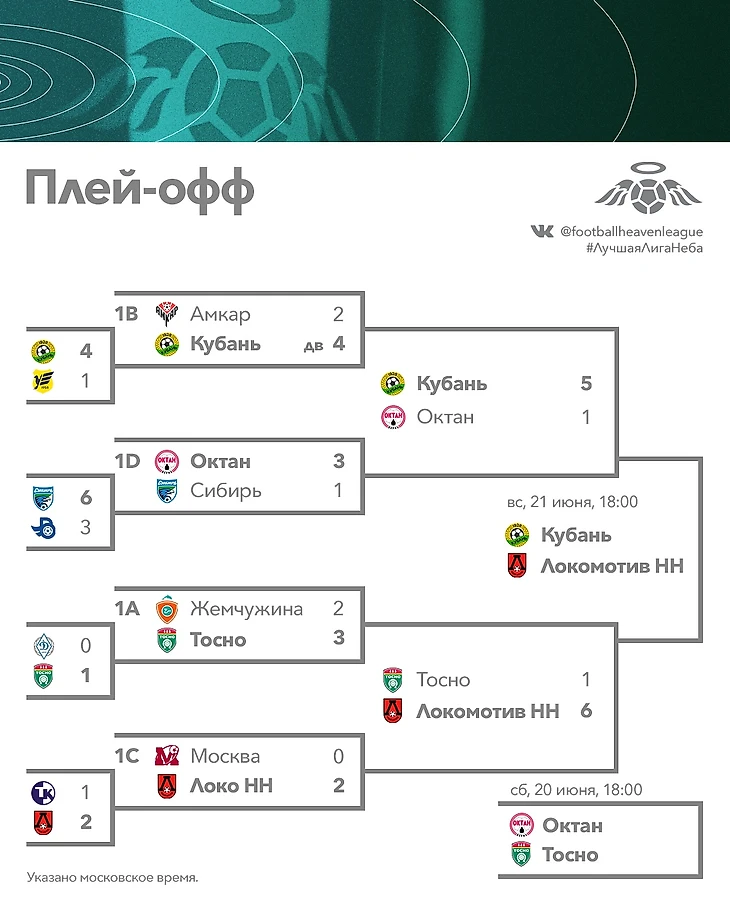 Сезон 2020 в Футбольной Небесной Лиге завершён: чемпионом стал нижегородский Локомотив, обыгравший в финале Кубань. Бронзовые медали завоевала главная сенсация турнира – пермский Октан, оказавшийся сильнее в матче за третье место.Всё по матчам этих выходных: расписание, статистика, трансляции и обзоры. Внутри каждой трансляции – таймкоды с голами и хайлайтами.