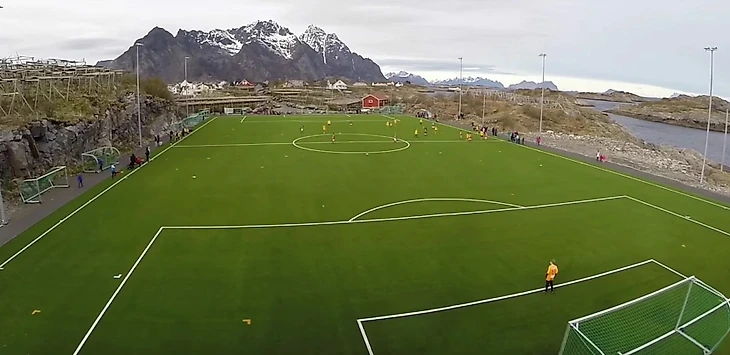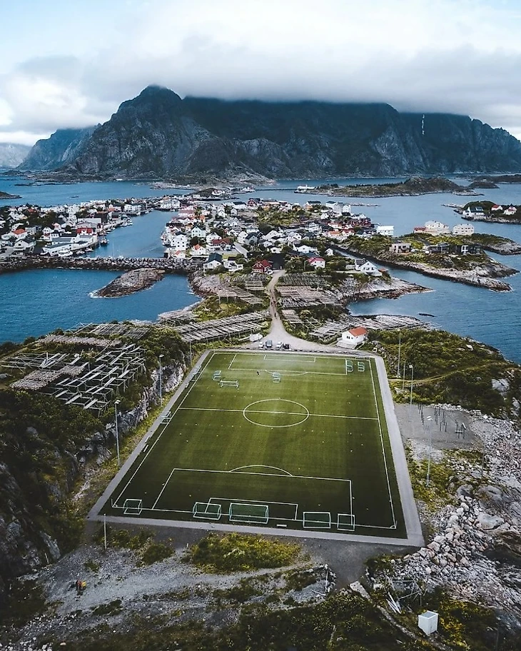 В небольшой рыбацкой деревне Хеннингсвер (Лофотенские острова, Норвегия) находится один самых красивых стадионов мира, расположенный на двух островах. У него нет трибун, полоса вокруг поля служит как автомобильной стоянкой, так и зоной для зрителей.