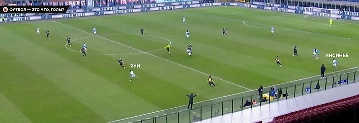 Про позиционную атаку Наполи. Для первой стадии розыгрыша Наполи образовывал тройку против пары нападающих Интера. Рядом с центральными защитниками оставался фланговый Ди Лоренцо. Также, при владении была еще одна заготовка: вингер Инсинье шел в нетипичные для себя зоны. Он буквально оказывался на позиции левого защитника и оттуда разгонял атаки, а уже левый защитник Руи уходил выше. Грубо говоря, они полностью менялись позициями.
