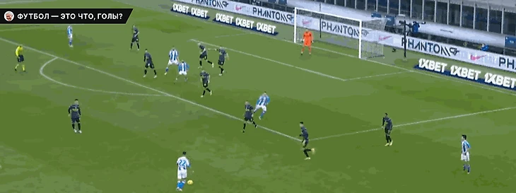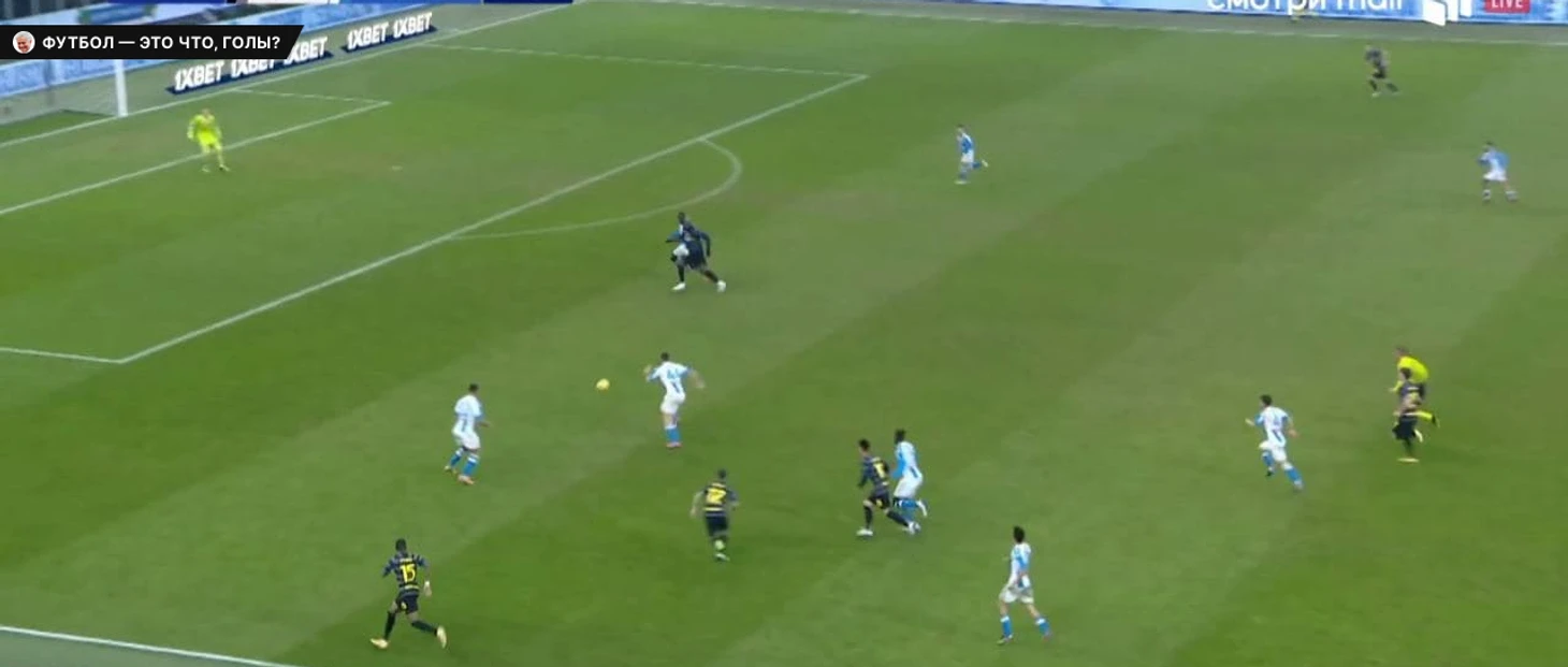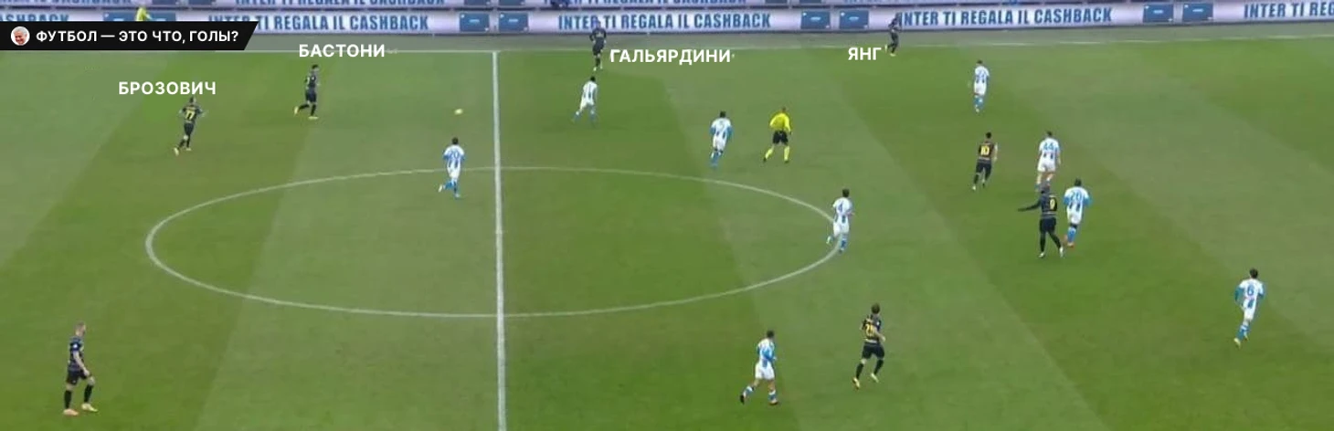 Атака Наполи. Интер растерялся от подключения в атаку Ди Лоренцо, который весь матч до этого играл 3м центральным, и встретить его было просто некому. Поэтому выдвижением навстречу Ди Лоренуо занялись сразу два игрока - Сенси и Бастони. Оба не успели, оба в полупозиции, Бастони бросил свою зону, Сенси ее не подстраховал. В свою очередь Зелиньски вовремя ее заполнил и был вознагражден пасом от Ди Лоренцо, а тут еще и Инсинье подоспел в эту проблемную зону. Он, в итоге, и завершал эту атаку, но гол не случился из-за шикарной реакции Хандановича.