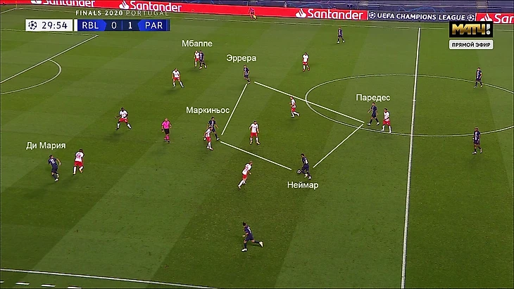 «Париж», забив быстрый гол, продолжил владеть мячом и высокого прессинговать. Первая половина встречи полностью за французской командой. Во втором тайме «РБ» нужно отыгрываться, и они логично раскрывают игру в обе стороны: атакуют количеством, но оставляя большие пространства под забегания супертройки ПСЖ в контратаки. На этот раз главной фигурой матча у Тухеля стал Леандро Паредес. Именно он, по задумке тренера, опускался к центральным защитникам для розыгрыша, а не Маркиньос. И Леандро вскрывал прессинг передачами на Неймара, который снова вышел ложной 9. Также Паредес сделал много простых, но важных для контроля ритма, передач - 94% точности.