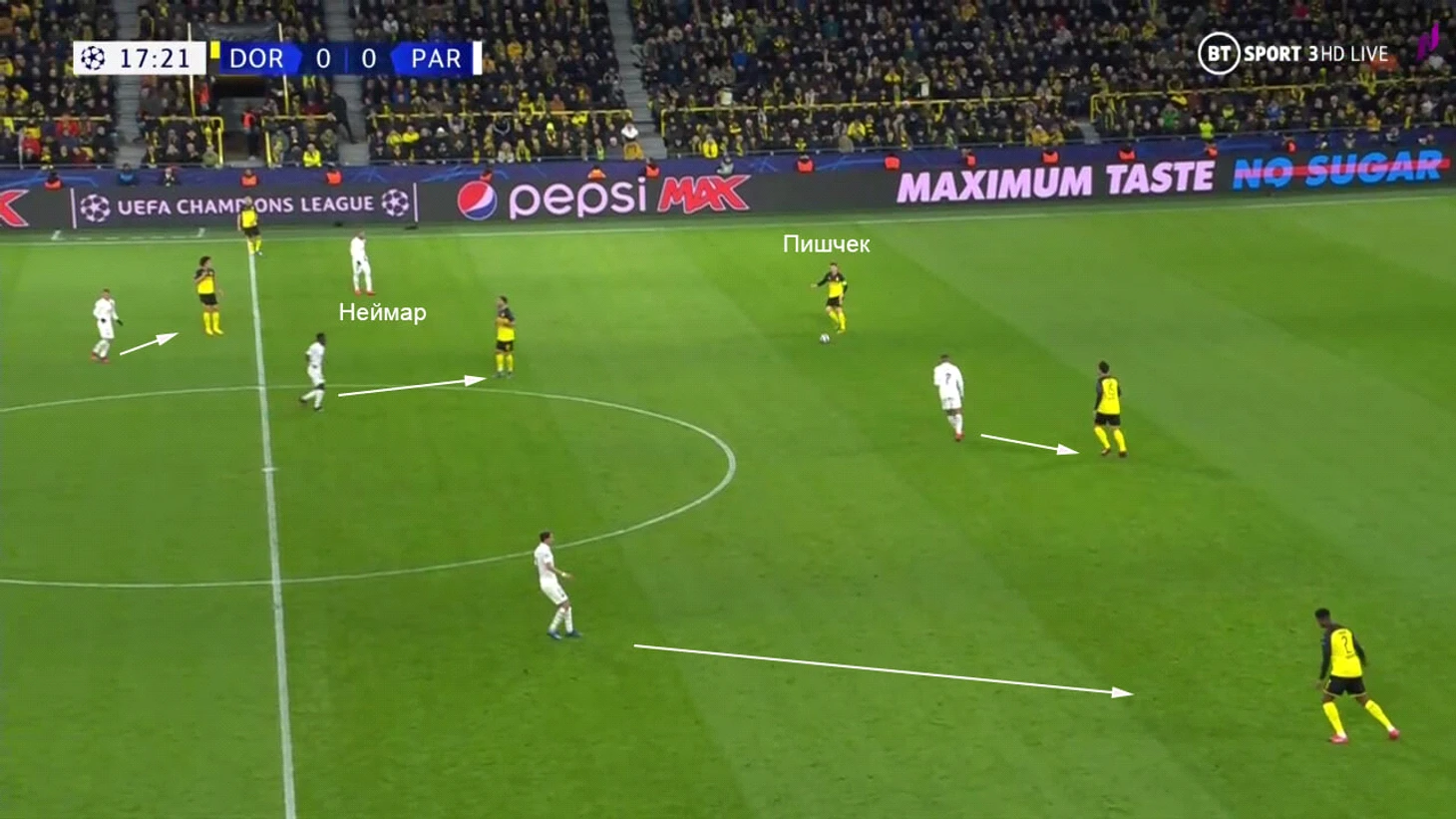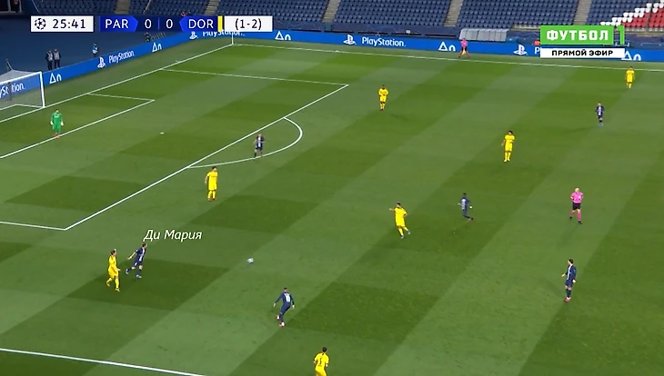 В ответном матче «Париж» возвращается к той самой схеме. Агрессивное начало с высоким прессингом и отличным контрпрессингом дают парижанам контроль над игрой. Игроки «Дортмунда» расположены слишком низко, откуда практически невозможно отвечать опасными контратаками. Главной фигурой в возврате владения становится Гана Гейе, игрок, за подписание которого так боролся Тухель. В высоком прессинге Томас тоже адаптировался под Неймара, но надо указать на то, что и сам Ней, как уже было сказано выше, работал на максимуме своих возможностей. «Дортмунд» был лишен возможности выхода из обороны через короткий пас. Ди Мария либо Сарабия – по ситуации выполняли большой объем работы в прессинге, чтобы страховать Неймара. Здесь Ди Мария помогает выдавить соперника на один фланг, а после перевода мчится уже в зону на другой: