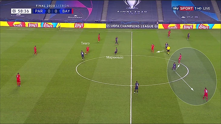 В финале Тухель решил дать небольшую свободу в размещении и действиях атакующему трио, оставляя их выше привычного. Это было сделано с целью проведения максимально эффективных контратак. Однако, в какой-то момент они стали уж слишком пассивны, явно выходя за рамки тренерских установок. Тухель себе не враг и не стал бы намеренно так сильно освобождать от оборонительных действий свое звёздное трио. Это бы делало команду слишком уязвимой. Но Неймар пассивен, Маркиньос начинает выдвигаться на Тиаго, чтобы отработать за Неймара, но в опорной теперь «лишний» свободный игрок. «Бавария» мастерски этим пользовалась (эпизод на скриншоте не является единственным таким моментом):