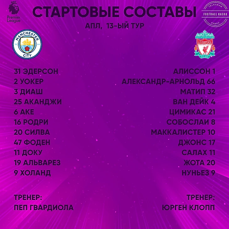 Потери Гвардиолы перед этим матчем были серьезнее, чем у Клоппа, потому что Пеп не мог рассчитывать почти на половину своей центральной оси: Кдб все ещё восстанавливается, Ковачич и Нуньеш сломались совсем недавно, но вот-вот должны вернуться, а ещё не было Грилиша. У Клоппа же из основных не было Робертсона, но он травмирован уже как месяц. Ещё у «Ливерпуля» не смогли сыграть Байчечич и Тьяго, но вряд ли эти потери можно назвать очень серьезными