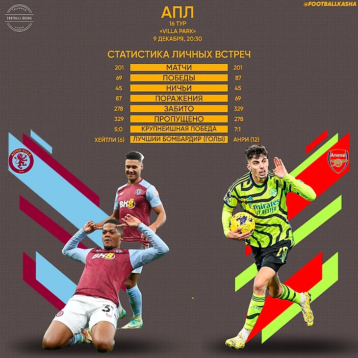 Лучший бомбардир в истории противостояния – Тьерри Анри с 12 забитыми мячами. На один меньше у Оливье Жиру. По 7 раз в ворота «Виллы» забивали Тони Вудкок, Ян Райт, а также выше упомянутый Тед Дрейк. Другая сторона баррикад может похвастаться лишь Тони Хателеем, который огорчал фанатов «Арсенала» 6 раз. Чем закончится сегодняшняя игра?