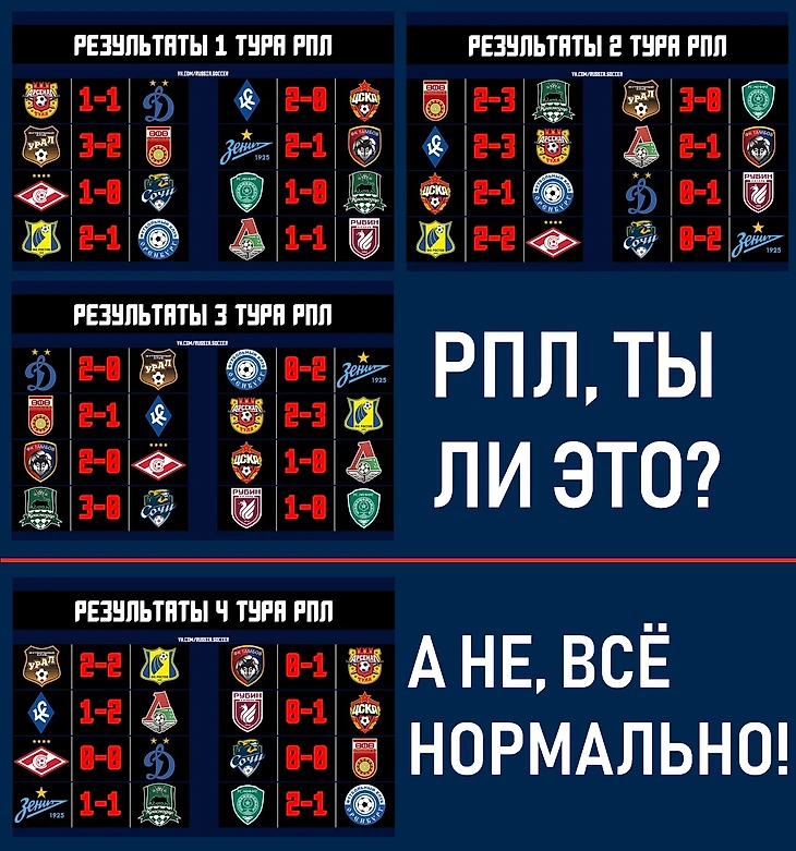 За первые 4 тура подопечные Егорова совершили уже в 11 матчах из 32 результативные ошибки. Треть матчей! Но у Егорова всё нормально, работа идёт. Непонятно только куда. А VAR только 2 матча в туре вводят И ни разу не поставили на матч столичной команды с региональной. Совпадение? Да, совпадение.