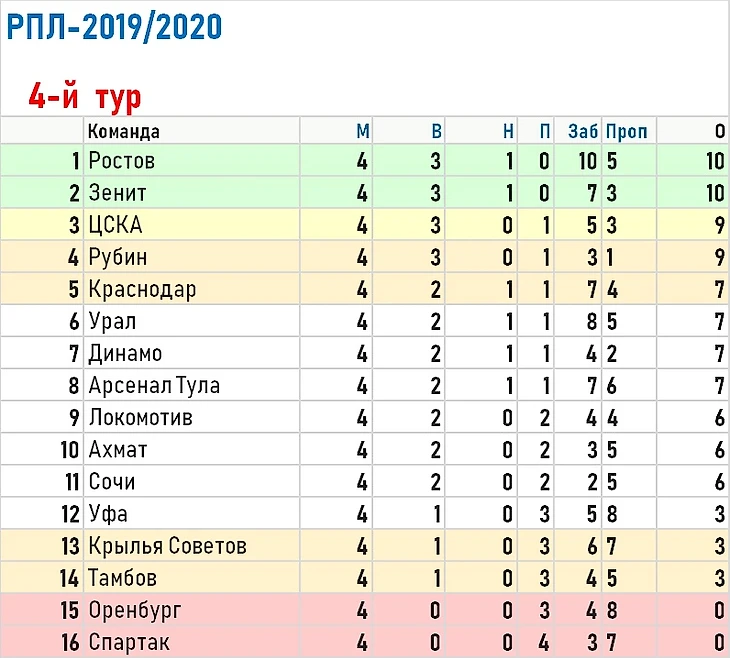 Честная таблица РПЛ-2019/2020. 4-й тур