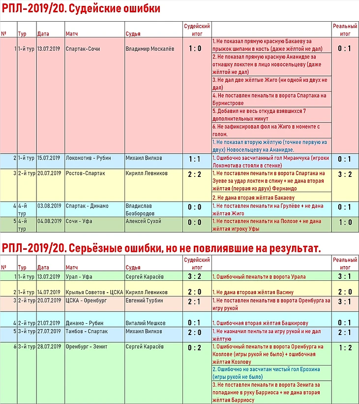 Всего за 4 тура судьи совершили в пользу Спартака 9 ошибок, то есть столько же сколько в пользу всех остальных 15 команд РПЛ вместе взятых) и сделали очковую разницу в пользу Спартака: