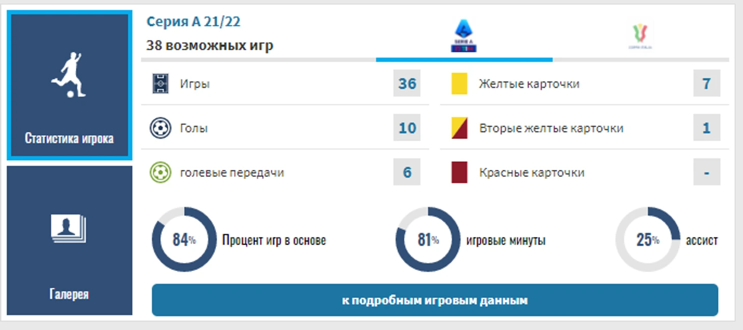 За 36 матчей 10 голов и 6 голевых, что не так уж и много, но достаточно, чтобы тобой начал интересоваться "Ювентус" или "Интер", так ещё и в таком раннем возрасте. Нравится мне этот паренёк, главное, чтобы не в Турин поехал.