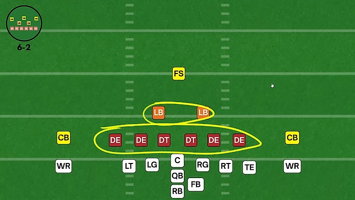 6-2 формациия: в защите шесть игроков ди-лайна и два лайнбекера, отсюда и ее название — 6-2.