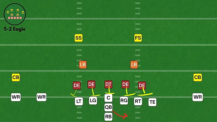 В формации 5-2 eagle у защиты на поле выходит: пять линейных, два лайнбекера и четыре ди-бека.