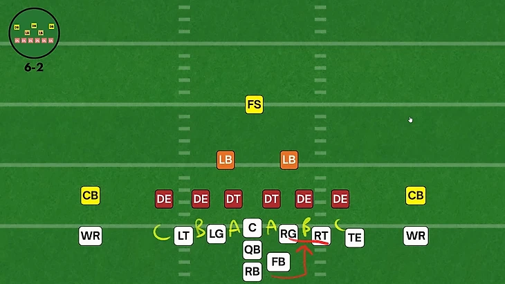 6-2 формация — это самая радикальная версия защиты против выноса. Шесть линейных обеспечивают контроль, закрывая все проходы между линейными нападения. Это так называемые проходы A между центровым и гардами, проходы B между гардами и тэклами, проходы C по внешней стороне тэклов.