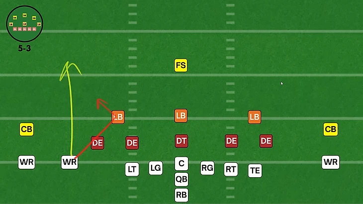 Если в нападении четыре или пять принимающих, то наличие в защите только трех ди-беков несет в себе уязвимость, так как четвертого и пятого принимающего нужно будет прикрывать лайнбекером, ➡️