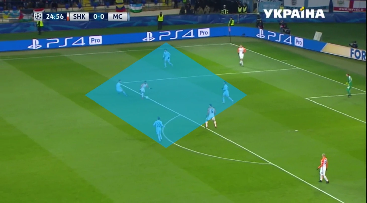 Команды, которые строят свои атаки, продвигая мяч постепенно через зоны и отказываются от бездумных забросов в борьбу, всегда должны располагать в своем составе как минимум хорошим глубинным плеймейкером, который устойчив под давлением, умеет освобождаться от опеки в начальной фазе атак и даже под прессингом может качественно продвигать атаку через короткий и средний пас. Цель «Шахтера», когда их высоко прессингуют - стянуть соперника на один фланг и за счет выверенного перевода на противоположный край выйти из под давления -> если угодно, overload или перегруз. И если в чемпионате Украины они часто вынуждены вскрывать низкий блок и не получают интенсивного сопротивления даже в средней трети поля, то в играх с «Сити» и «Наполи» действительно попадали под высокий и отлаженный прессинг на своей половине, который разбивали именно за счет успешных действий бразильца.