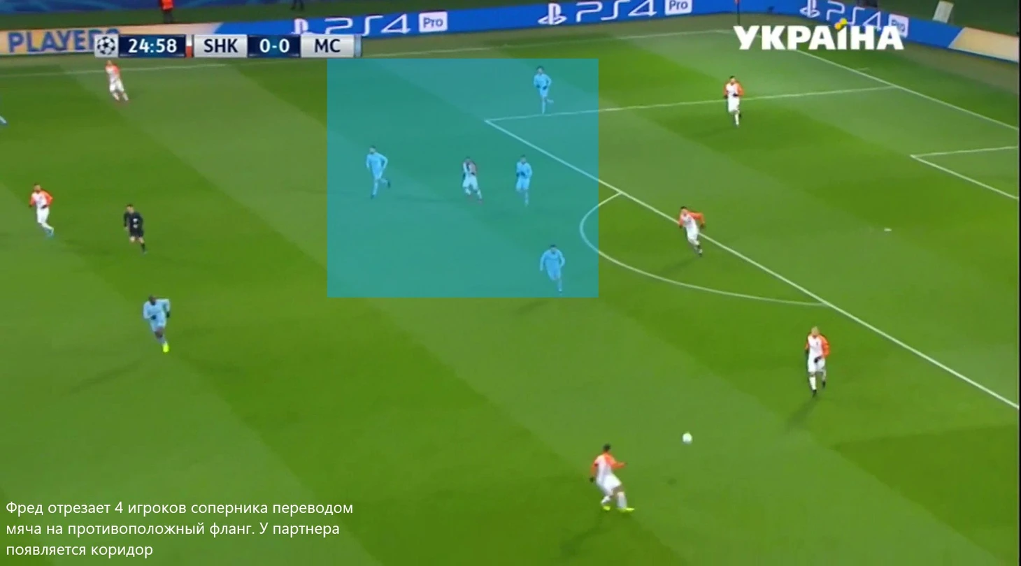 Когда дело доходит до вскрытия низкого блока, Фред тоже является очень полезной фигурой для команды – он конструирует атаки из глубины и доставляет мяч в высокие позиции между линий, где открываются игроки атакующей группы (часто – атакующий хавбек Бернард). При билдапе он может как опускаться на одну линию с центральными защитниками и глубоко забирать мяч, продвигая его через короткий и средний пас, так и задавать темп и вектор атаки в более высоких зонах – его расположение в конкретном случае можно варьировать в зависимости от ситуации. В то время, как его партнер по опорной зоне старается играть ближнему и достаточно пассивен при билдапе, Фред часто рискует и отрезает игроков соперника через пас. В победном матче с «Наполи», к примеру, он таким образом отрезал 56 соперников – это очень высокий показатель, учитывая достаточно компактный блок соперника и цифры по владению мячом – команда Фреда контролировала его всего 42,3% времени.