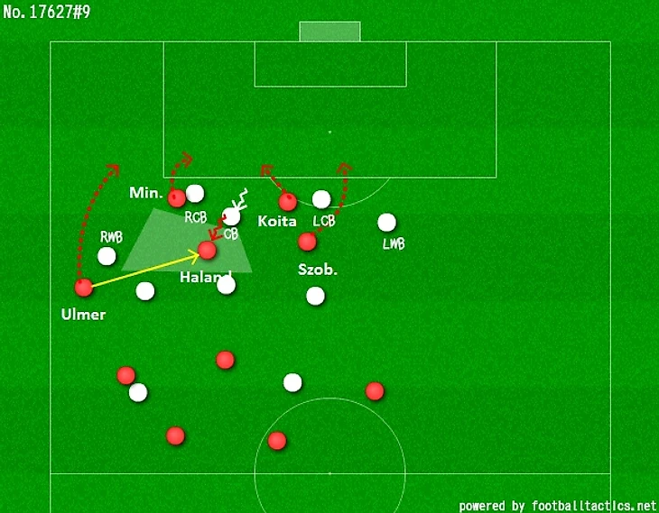 Здесь Халанд отскочил в глубину, попутно вытащив за собой самого центрального защитника, а под него открылись сразу 4 игрока. Это показательно и в том плане, как в целом располагаются игроки Зальцбурга в позиционной атаке: крайние полузащитники смещаются в полуфланги, между линий, а фуллбеки поочередно занимают высокие позиции.