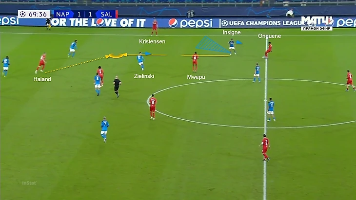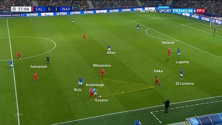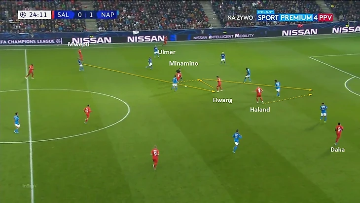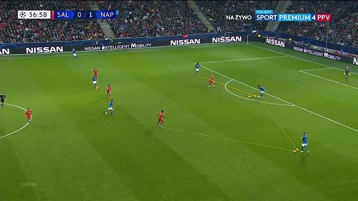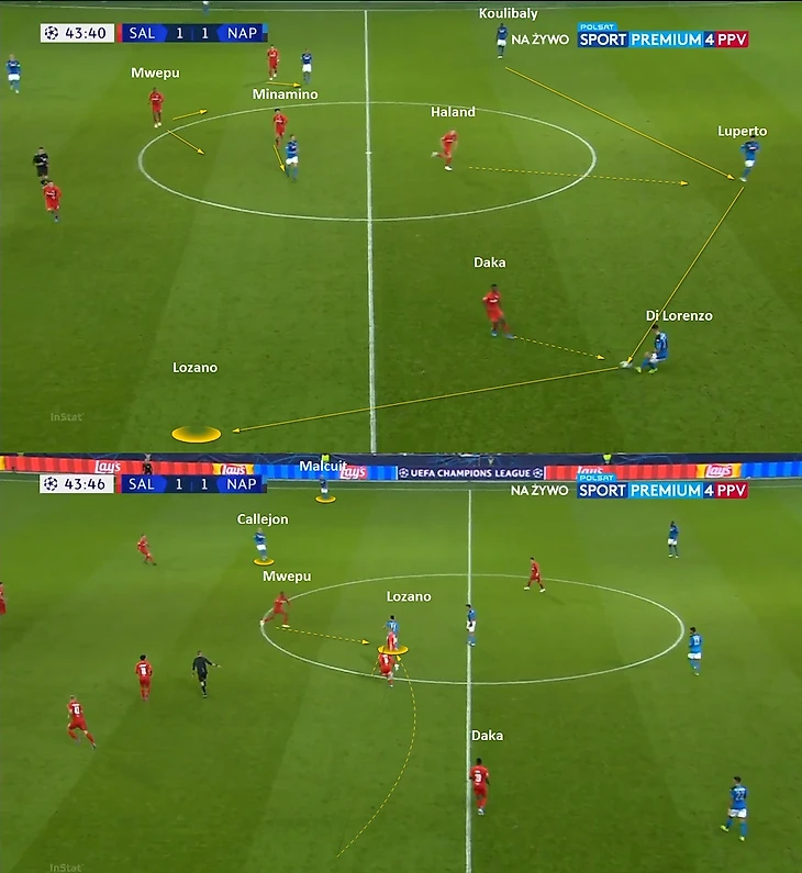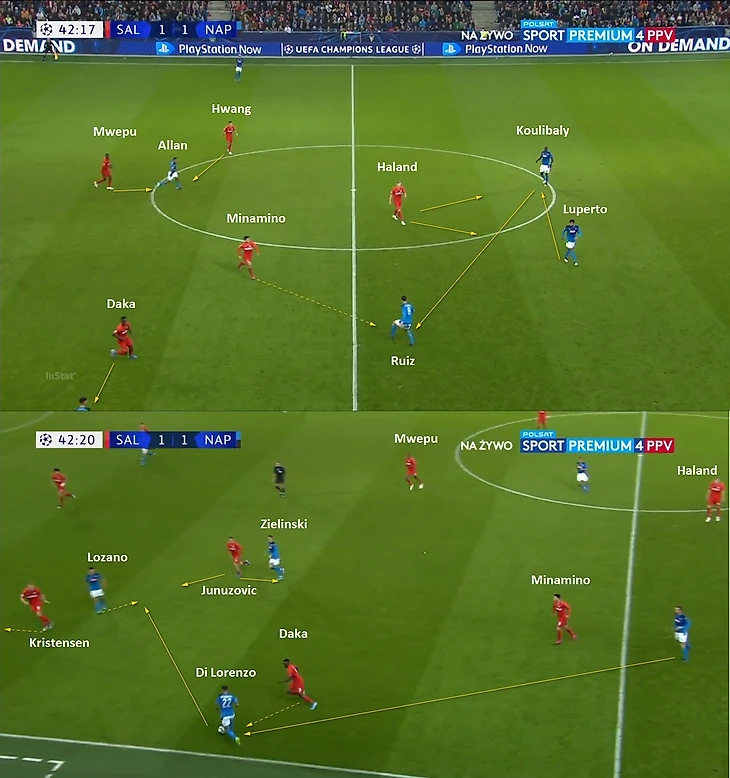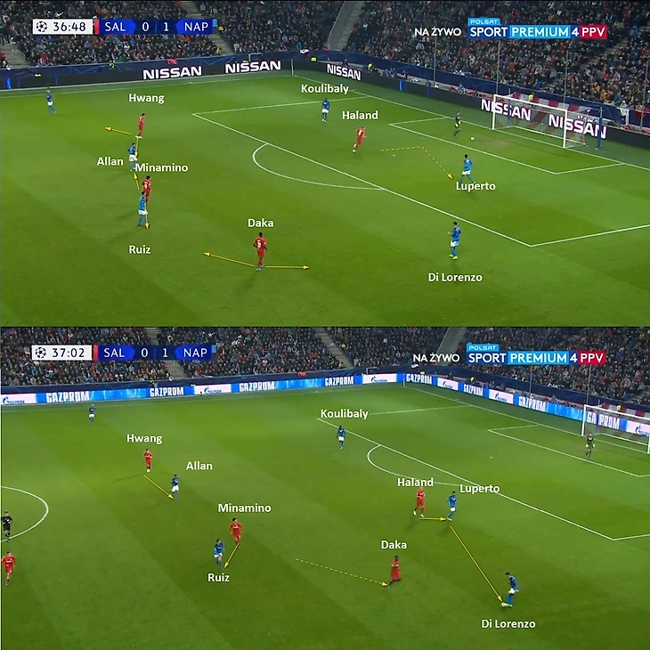 Проблемы начались, когда Наполи нашел антидот в виде переводов мяча с фланга на фланг. Движение второй линии прессинга Зальцбурга зависело от того, у кого из пары центральных защитников находился мяч: если у Луперто, то крен движения был на правый фланг; если у Кулибали, то весь компактный блок двигался к левому флангу. Поэтому была уязвимость, когда Наполи в минимум передач переводил мяч на другой фланг и начинал атаку: