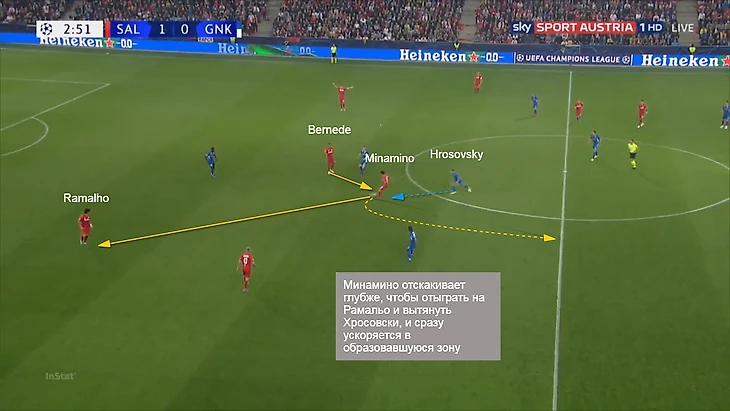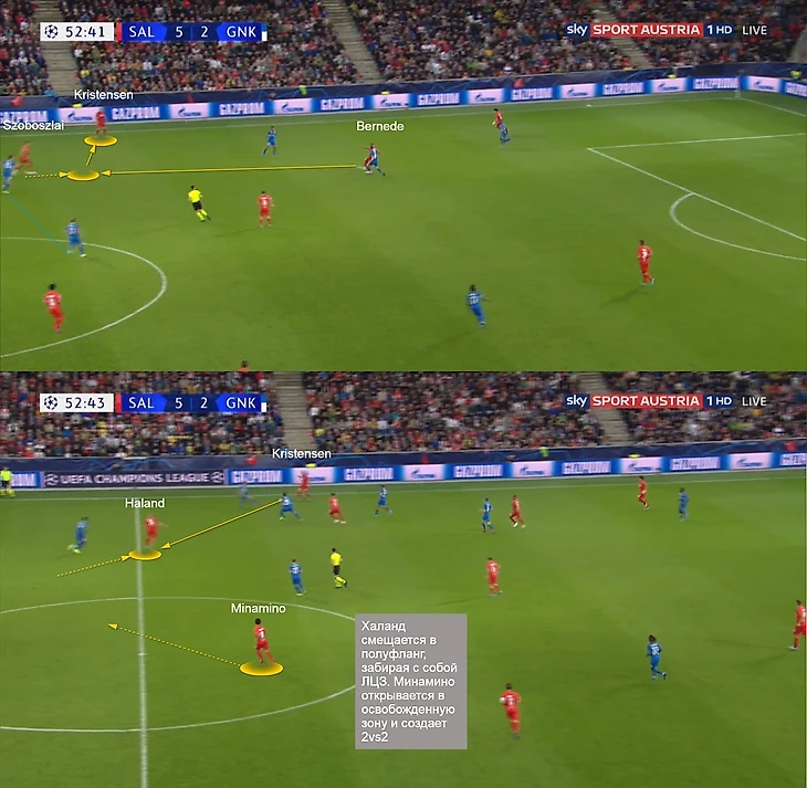 В обоих случаях Минамино старается либо ускориться в освобожденную зону, либо открываться под нападающего лицом к воротам, чтобы в 1-2 касания находить продолжение. В целом, десятка в системе Зальцбурга имеет очень гибкую роль: поддерживает нападающих (как за счёт открываний, так и проникающих передач), фуллбеков (например, опускаясь глубже как дополнительная опция) и шестерку, открываясь под него в билд-апе. Все это возможно благодаря вертикальной компактности в атаке.