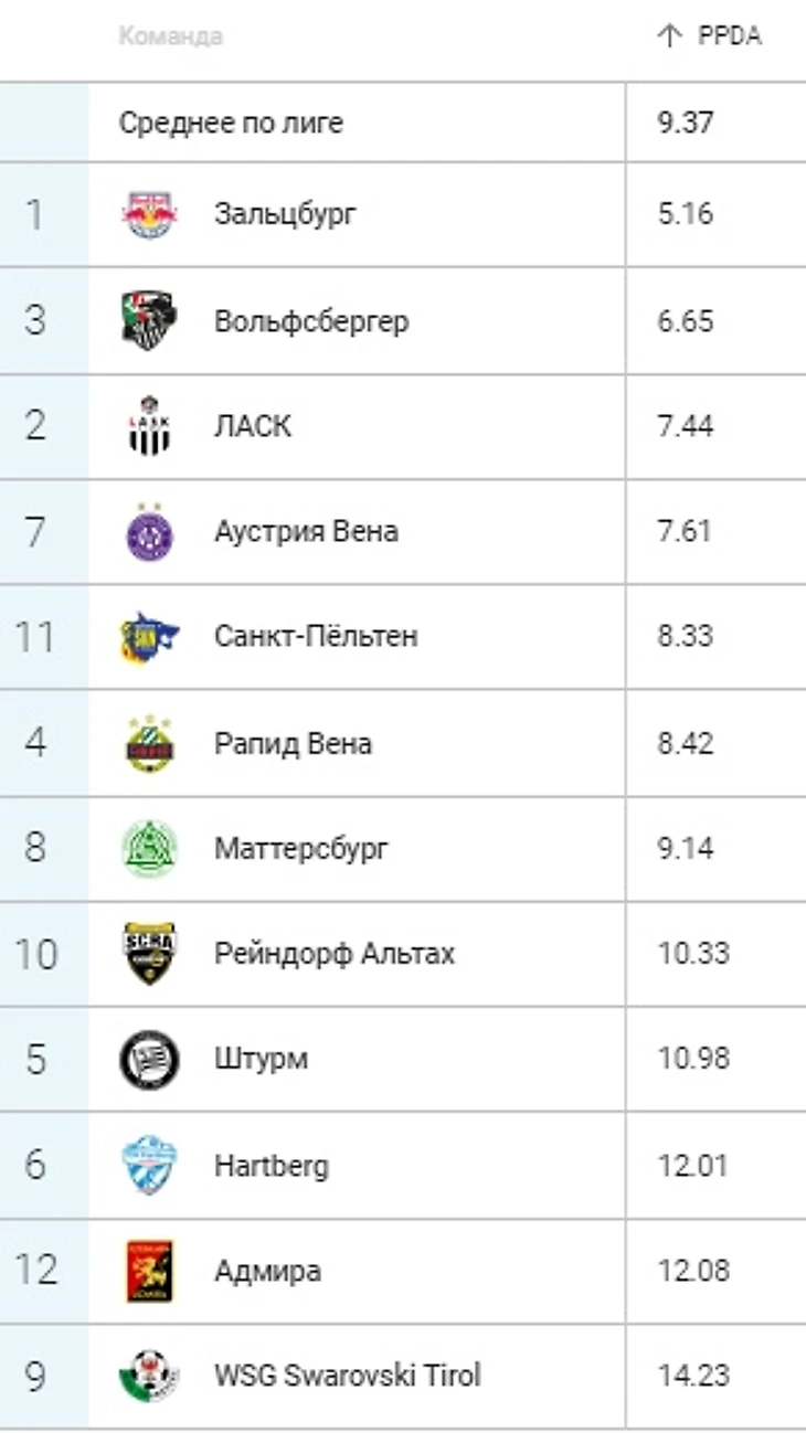 По данным Wyscout прессинг Зальцбурга самый интенсивный в австрийской бундеслиге. При этом, совсем недавно Skysport выкладывал сравнительные данные, из которых следует то, что под руководством Джесси Марша команда стала давить на соперников еще интенсивнее, чем в последнем сезоне при Марко Роузе.