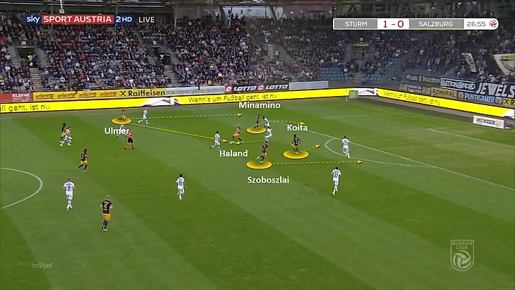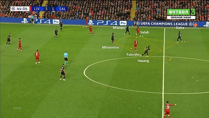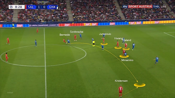 Очень много моментов в Зальцбурге завязано на комбинации с передачей «на третьего» и «пропусканием паса». Если Минамино при перехвате располагался глубоко или закрыт, то кто-то из двойки нападающих отскакивал в глубину (в каждой паре нападающих австрийцев есть ответственный за это, тут Хванг), в открытую позицию, а Минамино ускорялся на его место.