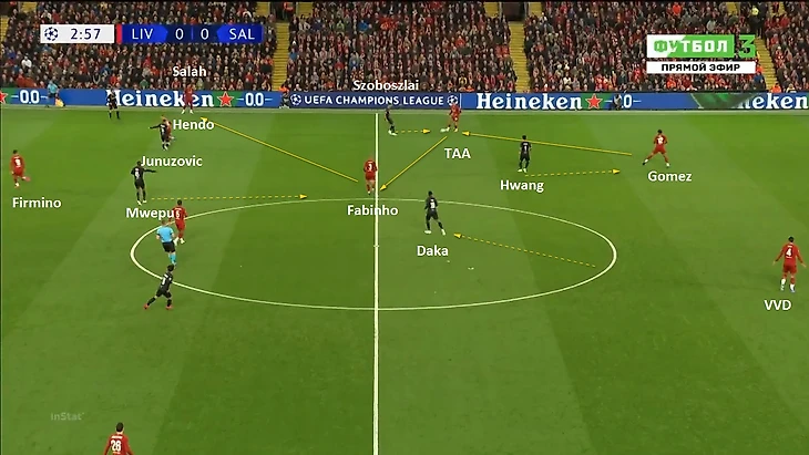 Матч с Ливерпулем был гибким по части прессинга и интересным в плане подстроек под соперника. Изначально Зальцбург вышел в расстановке 4-2-2-2 (и в атаке, и в обороне), которая считается основной в этом сезоне. Главная история начала первого тайма – свобода Фабиньо, которую он получал из-за пробелов в прессинге.