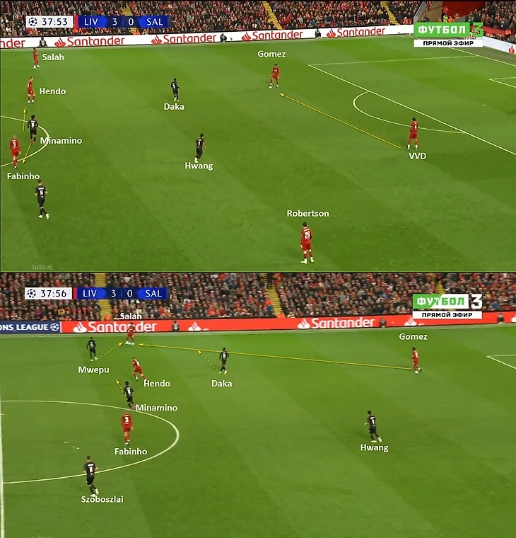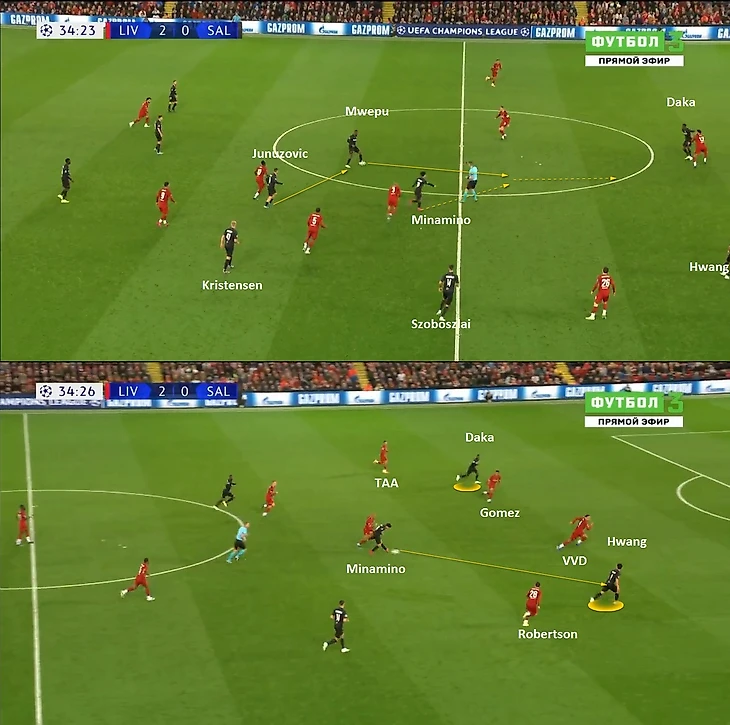 Теперь прессинг работал по такому принципу – Дака начинает давление по Гомесу, провоцируя его на передачу во фланг (ситуативно Салах и ТАА менялись позициями), при этом после передачи он продолжал движение так, чтобы перекрыть линию обратного паса. Мвепу, как левая восьмерка в ромбе, начинал прессинговать фуллбека (в данном эпизоде вингера) и закрывал возможность сыграть в полуфланг. Ульмер (левый защитник) опекал Арнольда, а Минамино блокировал передачу в центр. Хванг располагался так, чтобы блокировать передачу на дальнего центрального защитника (ван Дейка).