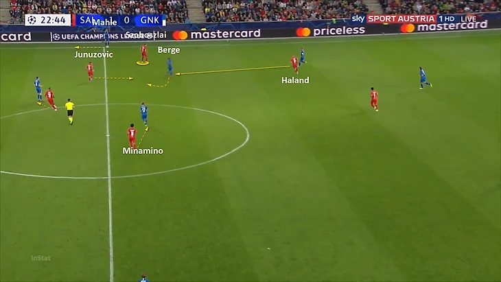 Это был один из редких моментов, когда Генк смог вскрыть прессинг Зальцбурга. В основном они выходили через забросы в карманы на фланге (зона от фуллбека до крайнего полузащитника, из-за компактности и узкой позиции Минамино-Собослаи),, либо пытались выйти через крайних защитников. В таком случае ловушка РБ захлопывалась – крайний полузащитник закрыл вариант с центром, нападающий обратную передачу, фуллбек вариант по флангу, а кто-то из пары опорных садился ниже в полуфланг, чтобы контролировать передачу туда и открывания.
