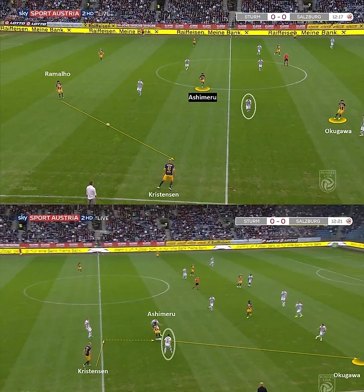 Здесь Кристенсен принимает мяч широко на фланге, а под него открываются сразу два игрока – Ашимеру, как дополнительная опция, чтобы сбросить давление восьмерки Штурма и забегание Окугавы за спину левому вингбэку. Это достаточно повторяющаяся история с несколькими вариантами развития событий: