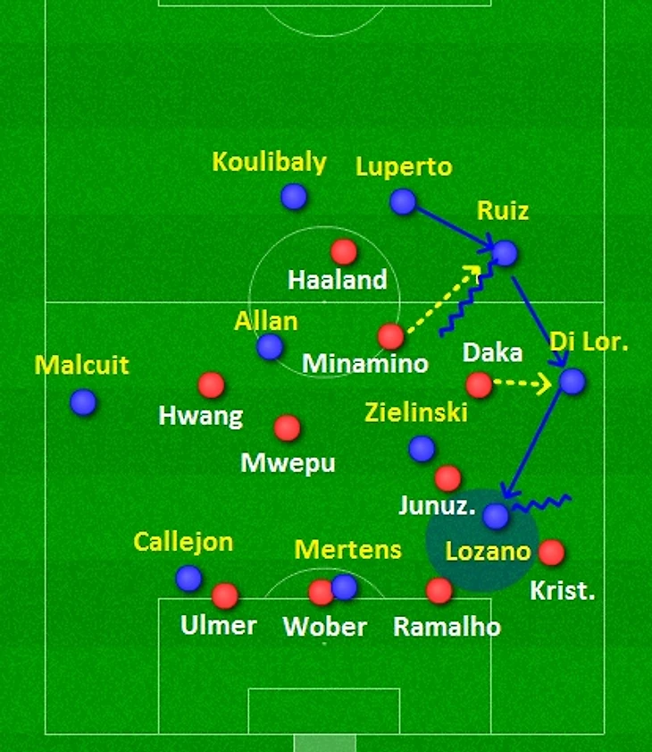 Против Наполи Джесси Марш использовал расстановку 4-2-3-1 в прессинге: Эрлинг Халанд начинал давление по Алексу Мерету, при этом закладывая траекторию движение и тело относительно вратаря Наполи так, чтобы спровоцировать его на передачу на Луперто (более слабого на мяче из двойки ЦЗ). При этом нижняя тройка Хванг – Минамино – Дака меняли своих оппонентов в зависимости от того, на какой фланг пойдет передача. Если Луперто делал пас на Ди Лоренцо, то по нему начинал прессинг Дака, закрывая возможность диагонали в полуфланг и навязывая давление, чтобы отобрать мяч. У Ди Лоренцо оставалось только одно направление – передача по флангу, т.к. обратный пас перекрыт Халандом, центр Аллан и Руис под опекой, а полуфланг уплотняет и давит Дака.