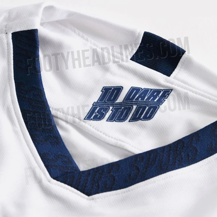 На воротнике и рукавах будет зациклена надпись «SPURS», а на внутренней части футболки расположен слоган команды: «TO DARE IS TO DO», что в переводе означает: «осмелиться – значит сделать». В остальном форма будет без каких-либо принтов или узоров.