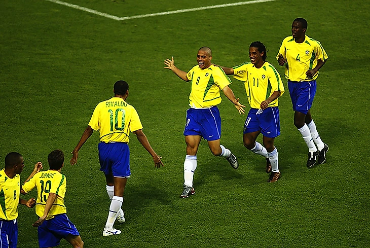 На групповой стадии бразильцы одержали три победы в трёх матчах - всё шло по плану. Крепко досталось сборным Коста-Рики - 5:2 и Китаю - 4:0. После этого Бразилия одолела ещё и сборную Турции 2:1. Роналдо забил в этих встречах 4 мяча, подтвердив свой статус самого опасного форварда мира. «Только бы не сломался в плей-офф» - говорили тогда его персональные болельщики. Впрочем, «тетракампеоны» располагали и другими «волшебниками» в линии атаки, один только Ривалдо чего стоит. А ещё у Бразилии в 2002-ом был молодой Роналдиньо. Скажу честно: я всё ещё считаю этого улыбчивого парня лучшим футболистом в истории. Почему? Расскажу в одной из будущий статей.