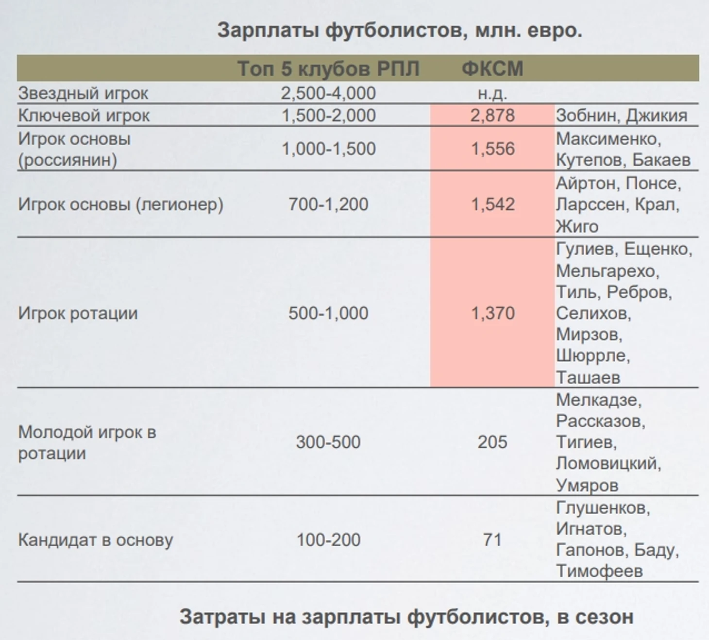 Сравнение с другими топ-клубами РПЛ тоже неутешительное - ключевые игроки, основные и даже игроки ротации получают больше, чем у других претендентов на медали. При этом, молодые игроки и группа озаглавленная “кандидаты в основу”, напротив зарабатывает меньше, чем у конкурентов. Примечательно, что в последнюю категорию входит великий и ужасный Малкольм Баду.