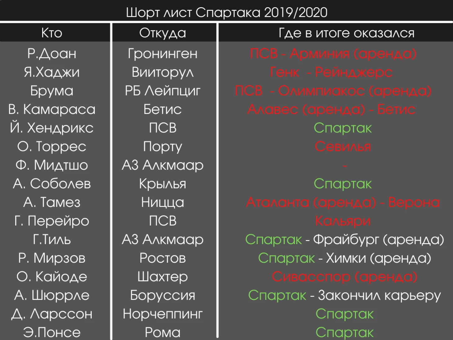 А еще, судя по всему, для полноты картины нам требуется подобный слив из ПСВ - двое из списка в итоге переехали именно туда, а двое игроков ПСВ могли переехать в Москву. Более того Йоррита Хендрикса в клубе из Эйндховена сменил Сангаре, которого прошлым летом также долго вел Спартак. Многовато пересечений, не находите?