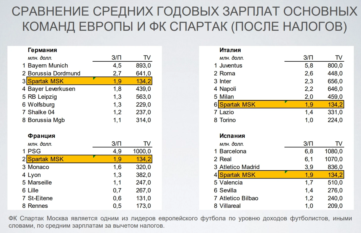 В Спартаке в среднем платят футболистам больше, чем в Байере, Севилье, Лацио, Лионе и других около-топ и вполне себе топ командах большой пятерки лиг. При этом общая стоимость состава у европейцев значительно выше.