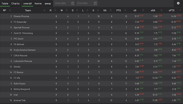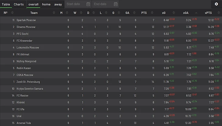 Виторию часто упрекают за дырявую защиту и это уже совсем несправедливо: прямо сейчас «Спартак» - лучшая команда лиги по допущенным моментам у своих ворот (xGA в таблице на скриншоте). Каждый из соперников «Спартака» (кроме «Крыльев» и «Урала», которые не забили вовсе) перебил собственный xG в матчах с красно-белыми, а в сравнении с матчами против других команд, оппоненты Спартака показали , либо свой худший атакующий перформанс в этом сезоне («Крылья, «Арсенал Тула»), либо один из худших («Рубин», «Урал»).