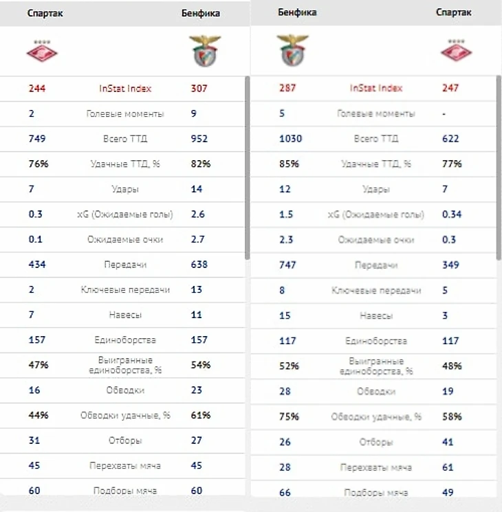 Кроме того, «Спартак» слабо проводит первые таймы: в 6 встречах (а если учитывать «Бенфику», то в 8) родили только один гол от Зобнина с «Уралом». Причем здесь фактор невезения присутствует в меньшей степени - создали, конечно, больше, но в целом во вторых таймах команда Витории значительно острее - 4.84 ожидаемых гола против 3.64.