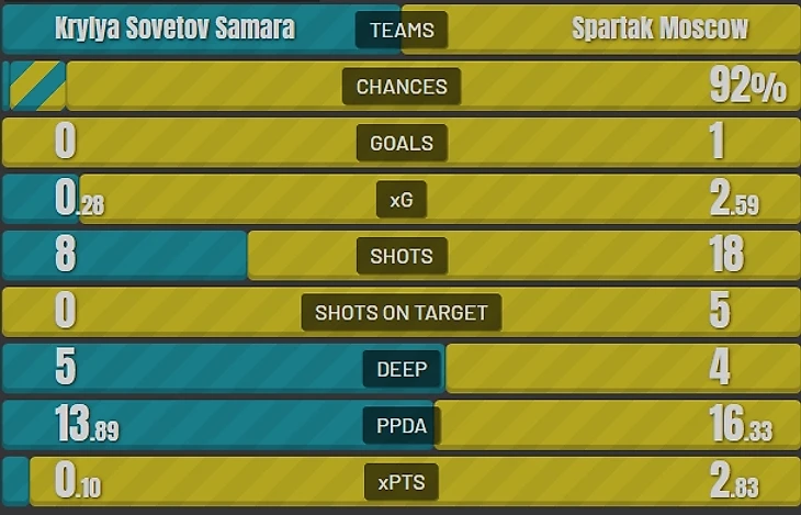 А теперь немного о том, почему прямо сейчас бежать в комментарии доказывать иноверцам, что «Спартак» - одна из сильнейших команд лиги прямо сейчас, не совсем верно. Вся эта идиллическая картина немного рушится о то, что у «Спартака» был едва ли не слабейший календарь на старте сезона: сразу два новичка лиги, два традиционных аутсайдера и две около-топ команды. Даже там, где Витории объективно не повезло, можно и нужно было создавать значительно больше у чужих ворот, а с этим явно есть проблемы. Однозначно сильным можно назвать только один матч - против Крыльев, с которыми даже без учета пенальти создали много и должны были забивать больше, зато ничего не дали создать сопернику.